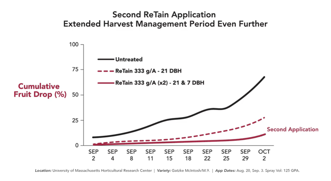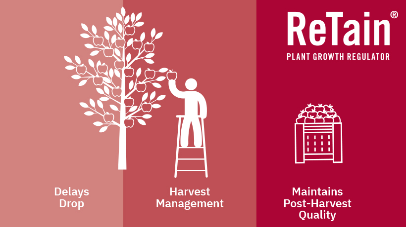 With ReTain® Plant Growth Regulator Soluble Powder, growers can delay fruit drop, extending the harvest window up to four weeks. This improves picking flexibility and labor management, while also increasing overall fruit quality and marketability. ReTain also delivers post-harvest benefits such as maintaining fruit firmness, reducing storage disorders like greasiness, and increasing packout rates in fruit stored long-term.